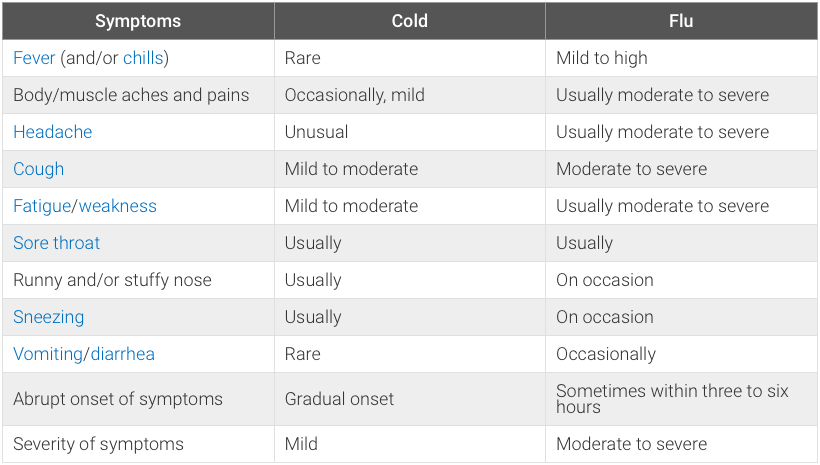As stated previously, sometimes it's difficult, especially in the early stages of infection, to tell the difference between a cold and the flu. However, there are some symptoms, if present, that may help distinguish between colds and the flu. They are summarized in the chart below.